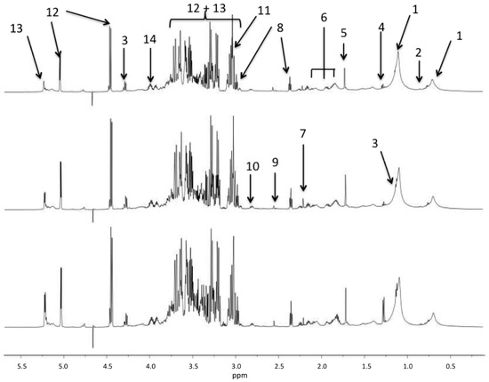 1H NMR spectral region between 0.5 and 6 ppm of Drosophila samples from the umanipulated (bottom), sham (middle), and sepsis survivor (top) groups. The main resonances are labeled according to metabolite assignments of the Table 1.