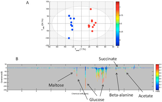 OPLS model comparing unmanipulated (blue) and sham (red) groups. The score plot (A) shows the variability of each sample according to their groups with Tpred axis representing the predictive axis and Torth, the orthogonal axis. Each dot corresponds to a spectrum; The loading plot (B) shows the covariance of the spectral bins colored according to the R values between the model and the belonging group. Positive signals correspond to metabolites present at increased concentrations in the sham group. Conversely, negative signals correspond to metabolites present at increased concentrations in the unmanipulated group.