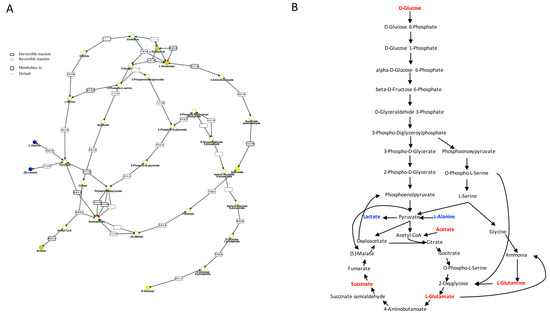 - Cottret, L.; Wildridge, D.; Vinson, F.; Barrett, M.P.; Charles, H.; Sagot, M.F.; Jourdan, F. MetExplore: A web server to link metabolomic experiments and genome-scale metabolic networks. Nucleic Acids Res. 2010, 38 (Suppl. S2), W132–W137. [Google Scholar] [CrossRef] [PubMed]