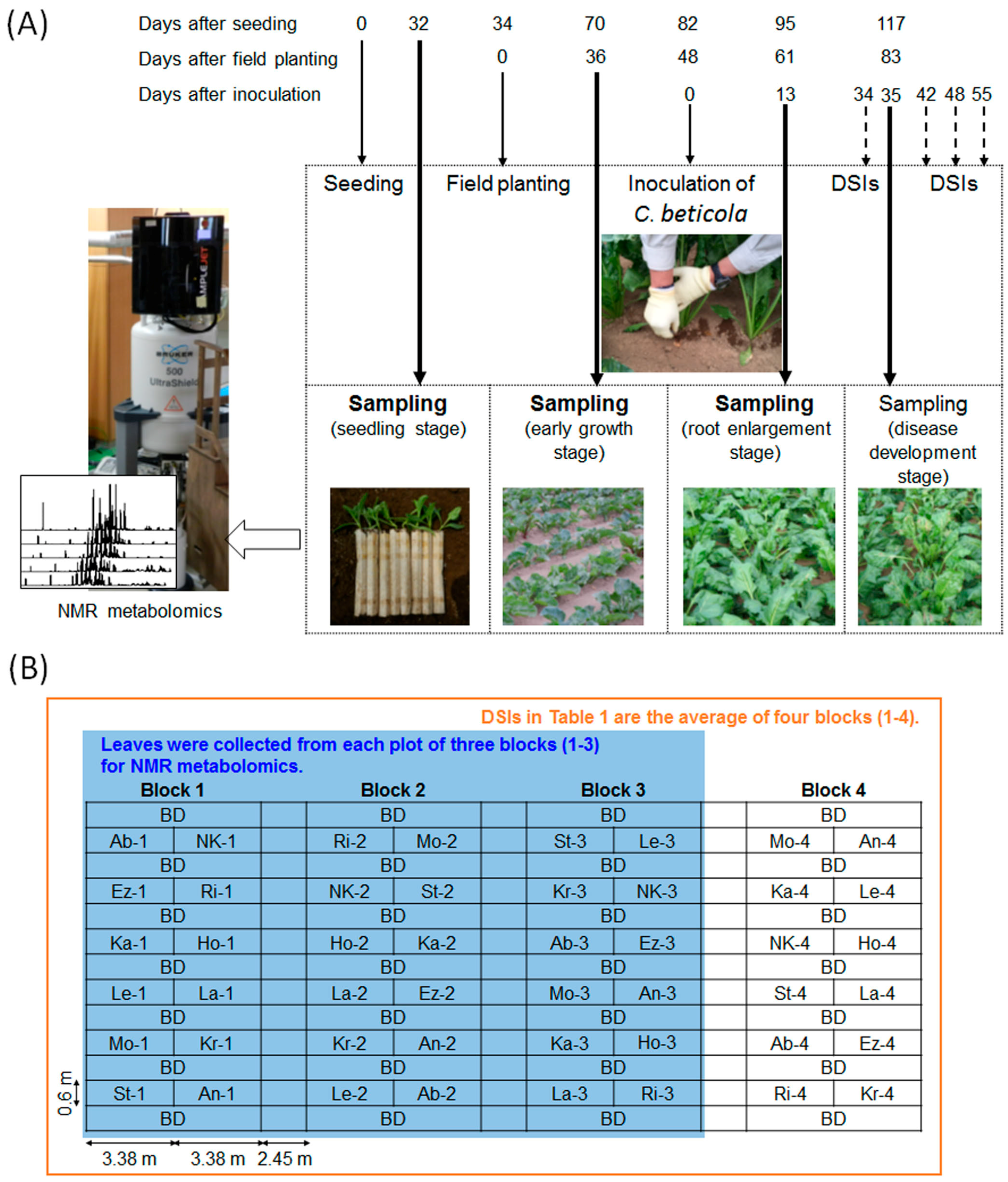 (A) Sampling timetable during field testing of Cercospora leaf spot (CLS) resistance. The thin, bold, and dashed arrows indicate the schedules for cultivation, sampling time points, and recording disease severity indices (DSIs), respectively; (B) Block design for the field test. The individual plot size for each genotype was 2.03 m2 (3.38 m × 0.6 m), and the plant density was 15 plants per plot. Each plot is described by genotype abbreviation and block number. For NMR metabolomics, leaves were collected from one plant in each plot of three blocks as samples 1–3. A DSI was given to each plot of four blocks and a DSI for a sugar beet genotype in Table 1 was calculated by averaging DSIs across four blocks. BD: uninoculated border plots of the highly resistant cultivar Rivolta (Ri).