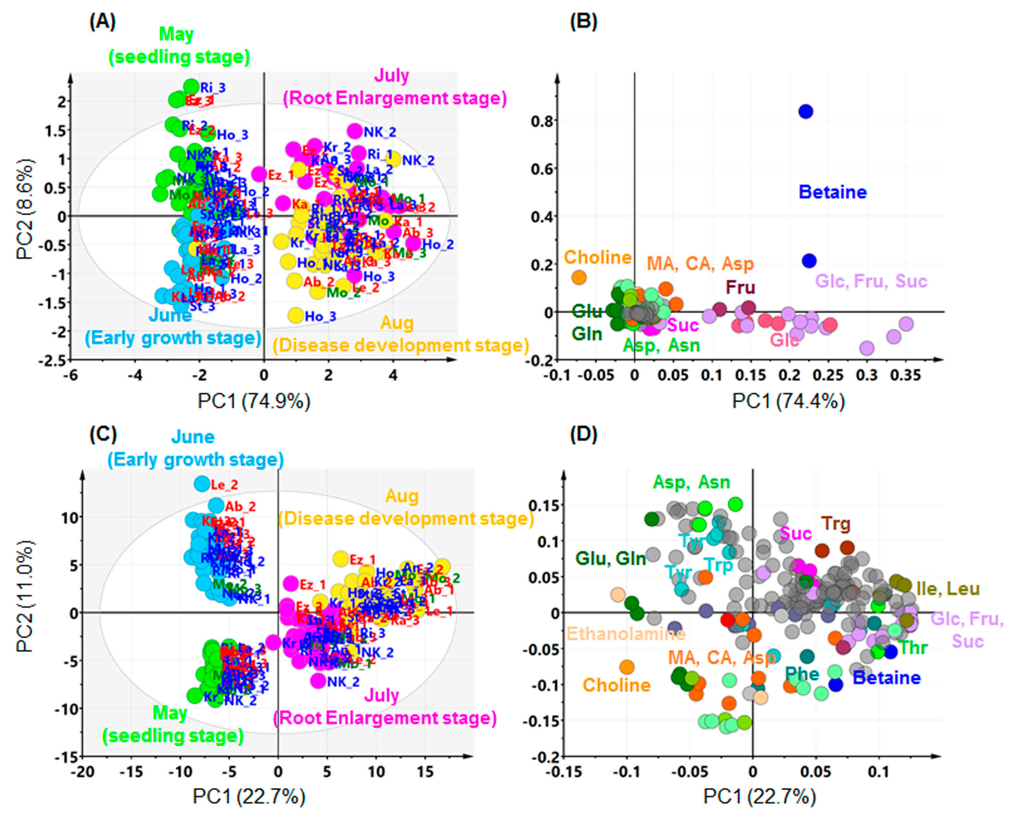 The following are available online at www.mdpi.com/2218-1989/7/1/4/s1, Figure S1: Daily values of mean air temperature, mean relative humidity, and rainfall during the field trial in 2015 (Memuro, Hokkaido, Japan; 42°89.2′N/143°0.7.7′E, 92 m a.s.l.); Figure S2: Metabolite annotation of representative 1H-NMR spectra of sugar beet leaf samples; Figure S3: PCs 3 and 4 plane of the PCA score (A,C) and loading (B,D) plots of NMR data of sugar beet leaves; Figure S4: Expanded views of an aromatic region of 1H-13C HSQC (A), 1H-1H DQF-COSY (B), and 1H-1H TOCSY (C) spectra of Ez-2 (blue) and NK-1 (red) at the seedling stage; Figure S5: Relative intensity of the isolated NMR buckets annotated to GABA (1.882–1.856 ppm) and Gln (2.470–2.440 ppm) at the early growth stage (A,B), Gln at the root-enlargement stage (C), and Fru (4.110–4.101 ppm) at the disease development stage (D); Table S1: PLS model parameters derived from the 1H-NMR spectra of sugar beet leaves. DSIs recorded at four time points were separately used as Y variables; Table S2: OPLS model parameters derived from the 1H-NMR spectra of sugar beet leaves. DSIs recorded at four time points were separately used as Y variables; Table S3: The number of permuted R2 and Q2 values exceeding the original values for PLS models; Table S4: The number of permuted R2 and Q2 values exceeding the original values for OPLS models; Table S5: NMR buckets with the highest PLS VIP values (rank 1–20) at the seedling stage; Table S6: NMR buckets with the highest PLS VIP values (rank 1–20) at the early growth stage; Table S7: NMR buckets with the highest PLS VIP values (rank 1–20) at the root-enlargement stage; Table S8: NMR buckets with the highest PLS VIP values (rank 1–20) at the disease-development stage; Table S9: NMR buckets with the highest OPLS VIP values (rank 1–20) at the seedling stage; Table S10: NMR buckets with the highest OPLS VIP values (rank 1–20) at the early growth stage; Table S11: NMR buckets with the highest OPLS VIP values (rank 1–20) at the root-enlargement stage; Table S12: NMR buckets with the highest OPLS VIP values (rank 1–20) at the disease-development stage; Table S13: Pearson’s correlation coefficient between the original intensity of NMR buckets (normalized to the intensity of DSS) and DSIs. The buckets with |r| > 0.5 are listed; Table S14: The NMR buckets strongly contributing to discriminating CLS resistance in sugar beet leaves.