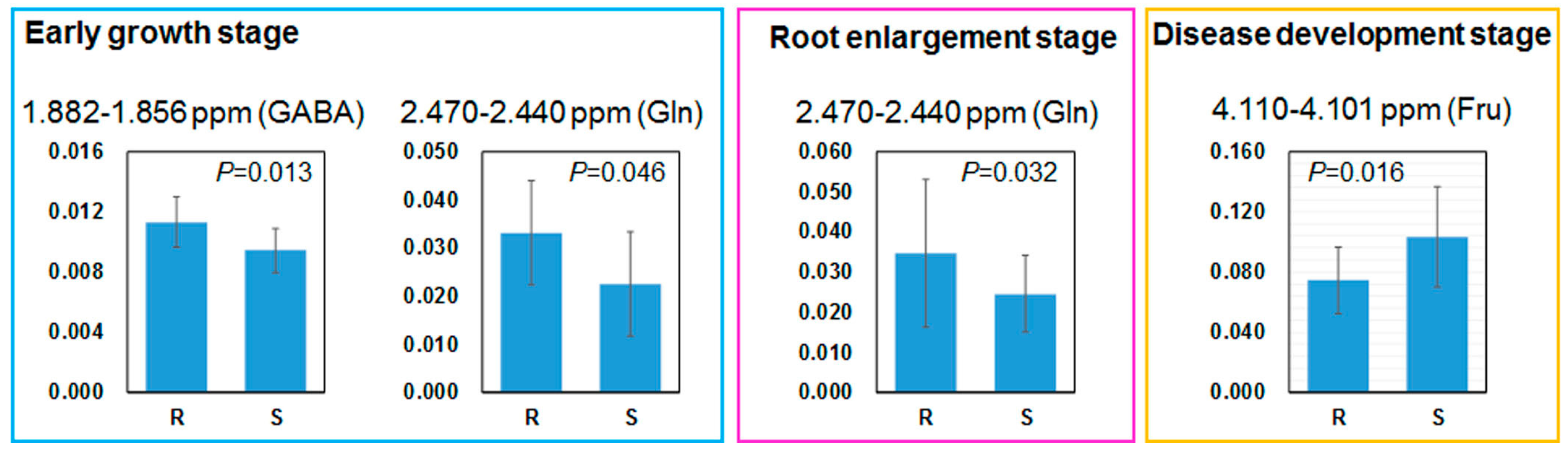 Relative intensity of the isolated NMR regions annotated to 4-aminobutyrate (GABA) (1.882–1.856 ppm) and glutamine (Gln) (2.470–2.440 ppm) at the early growth stage, Gln at the root enlargement stage, and Fru (4.316–4.290 ppm) at the disease development stage. S: susceptible group; and R: resistant group.
