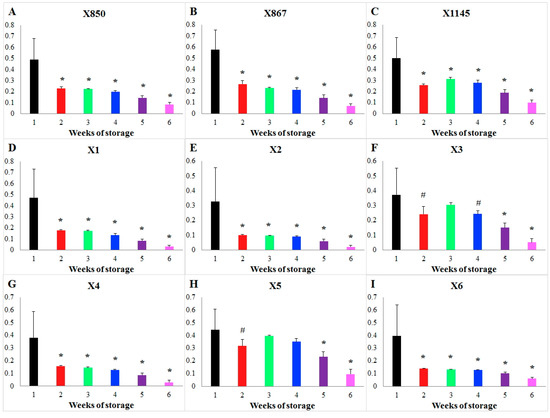 Comparison of the storage time effect on the enzyme PK during different weeks of storage for each donor. Storage time effects on the PK flux are compared week by week for each donor. Bar graphs show the weekly averaged storage effects and standard deviations. The X-axis represents storage time (unit: weeks), while the Y-axis shows the effect on the activity of the enzyme PK. Each subplot represents the comparison in a donor whose ID is shown in its title, (A) donor X850; (B) donor X867; (C) donor X1145; (D) donor X1; (E) donor X2; (F) donor X3; (G) donor X4; (H) donor X5; (I) donor X6. Significance level: * (p < 0.01) for the statistical difference between a corresponding week (2–6) and the 1st week in terms of weekly averaged storage time effects.