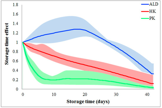 Comparison of storage time effects among fluxes. Storage time effects are compared among fluxes HK, PK, and ALD. Solid color lines represent the averages of storage time effects on each flux among donors, while the colored areas indicate variations. The X-axis represents storage time (unit: days), while the Y-axis shows storage time effects.