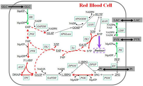 - Holzhütter, H.G.; Jacobasch, G.; Bisdorff, A. Mathematical modelling of metabolic pathways affected by an enzyme deficiency. A mathematical model of glycolysis in normal and pyruvate-kinase-deficient red blood cells. Eur. J. Biochem. 1985, 149, 101–111. [Google Scholar] [CrossRef] [PubMed]