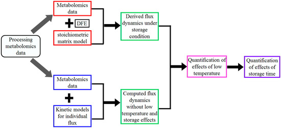 As a schematic illustration, Figure 5 shows the flow chart for the analysis of metabolomics data and the quantification of storage effects using the proposed “quantification of dynamic enzymatic change” (QDEC) method, whose details are discussed in the following.