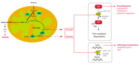 Other important members of the 2-OG dependent dioxygenases family are the DNA and histone demethylases, namely the ten eleven translocation (TET) enzymes and histone lysine demethylase (KDM) family of JmjC-domain containing proteins. Oxidative demethylation of DNA is mediated by TET enzymes, which hydroxylate 5-methylcytosine (5mC) into 5-hydroxy-methylcytosine (5hmC) [50,51]. It was shown that inhibition of TET enzymes by succinate leads to a high abundance of DNA methylation and a low abundance of DNA hydroxymethylation in SDH-related PPGL [43] and GIST [52] (Figure 1). This has massive consequences on gene expression as hypermethylation of CpG islands within the promoter regions of genes is frequently associated with the repression of transcription. Hence, SDH mutant cells, by reprogramming the transcriptome at the whole genome scale, foster tumorigenesis by repressing the expression of genes that promote cancer stem cell identity [53], and Epithelial-to-Mesenchymal Transition (EMT) [54]. An EMT like phenotype has indeed been described in both SDHB-mutated metastatic human PPGL [55] and cells [56], as well as in FH-deficient cells [57]. This phenotype is regulated by epigenetic modifications, that comprise the hypermethylator phenotype, but also the dysregulation of key target microRNAs [4,57]. Because of their central role in the acquisition of tumour hallmarks by SDH- and FH-deficient cells, succinate and fumarate are now referred to as “oncometabolites”, as 2-hydroxyglutarate, the organic acid generated by mutant isocitrate dehydrogenase mutants in gliomas and acute myeloid leukaemia [58].