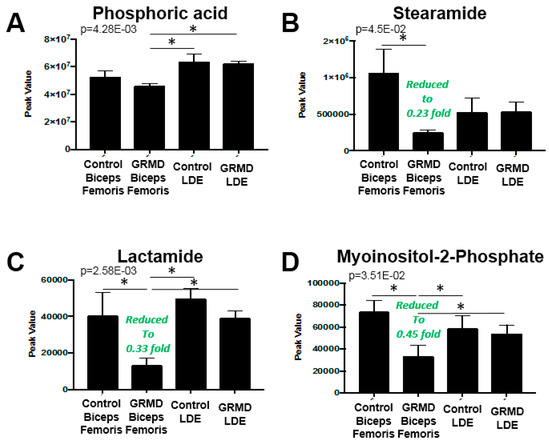 Comparison of Peak values of ANOVA metabolites in GRMD LDE and BF muscles by untargeted metabolomics. Peak values of GRMD LDE and BF (A) phosphoric acid; (B) stearamide; (C) lactamide; and (D) myosinositol-2-phosphate. Analysis by Metaboanalyst analysis of GRMD (N = 6) vs. control (N = 4) long digital extensor metabolites. Data is presented as the mean +/- SEM.