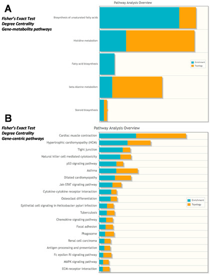 Integrated metabolomics analysis using recently published microarray analysis. Fisher’s exact test using degree centrality was performed using (A) Gene-metabolite pathways or (B) Gene-centric pathways in Metaboanalyst. GRMD significant metabolites (t-test, VIP >2.0 listed in Table S2) and mRNA >1.9 or < −1.3 fold from GRMD muscle (downloaded from GEO, as published in Pediatr Res. 2016 Apr;79(4):629-36) and listed in Table S3 with fold change calculations) were included in the Metaboanalyst integrated analysis.