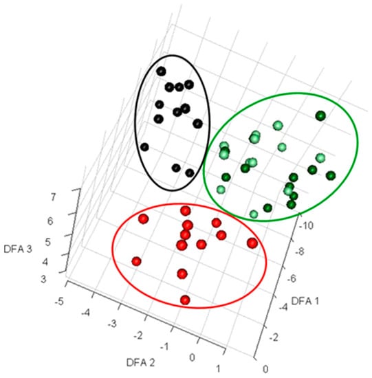 Discriminant function analysis (DFA) to visualize exometabolomics data. Extracellular metabolites from deliberately contaminated and control samples from microalgal fermentation were analyzed using Gas-chromatography and mass spectrometry (GC-MS) [42]. The data from 56 samples were log transformed prior to performing DFA and three distinct clusters were observed. Here, black circles represent the samples from flasks contaminated with Pseudomonas aeruginosa, red circles show the samples contaminated by Bacillus subtilis, and light green and dark green circles present the samples collected from contaminated flasks at time 0 and non-contaminated flasks, respectively. This figure was reproduced from Sue et al. with the authors’ permission [42].