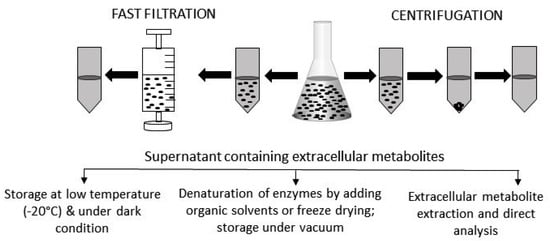 Extracellular sample preparation, handling, and storage. After centrifugation or fast filtration, culture media containing extracellular metabolites are usually stored at a low temperature and under dark conditions. Sometime, organic solvents are added to denature active enzymes. For some metabolites, specific extraction procedures need to be followed before being analyzed by appropriate instruments. Prior to analysis, extracellular samples are often freeze-dried to concentrate the level of metabolites.