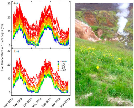 - Sigurdsson, B.D.; Leblans, N.I.W.; Dauwe, S.; Guðmundsdóttir, E.; Gundersen, P.; Gunnarsdóttir, G.E.; Holmstrup, M.; Ilieva-Makulec, K.; Kätterer, T.; Marteinsdóttir, B.; et al. Geothermal ecosystems as natural climate change experiments: The ForHot research site in Iceland as a case study. Icelandic Agric. Sci. 2016, 29, 53–71. [Google Scholar] [CrossRef]