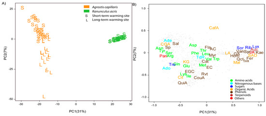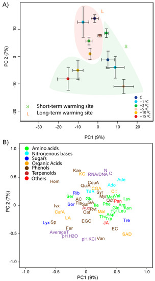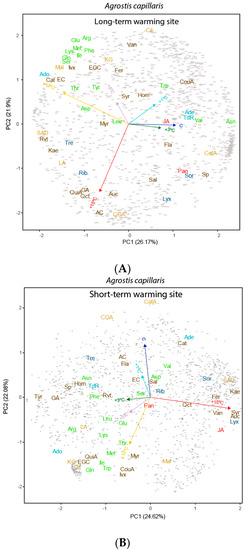 3.2. Effects of Length and Level of Warming on the Metabolome of A. capillaris