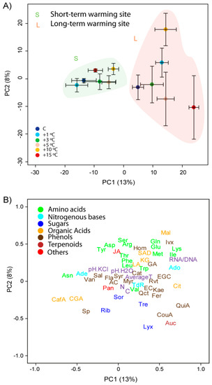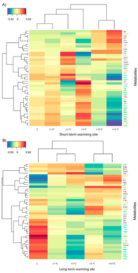 - Gargallo-Garriga, A.; Sardans, J.; Pérez-Trujillo, M.; Oravec, M.; Urban, O.; Jentsch, A.; Kreyling, J.; Beierkuhnlein, C.; Parella, T.; Peñuelas, J. Warming differentially influences the effects of drought on stoichiometry and metabolomics in shoots and roots. New Phytol. 2015, 207, 591–603. [Google Scholar] [CrossRef] [PubMed]