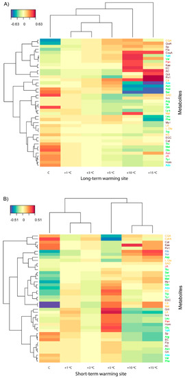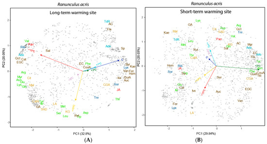 3.3. Effects of Length and Level of Warming on the Metabolome of R. acris