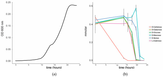 Sugar utilization by C. fimi in Basal Salt Medium with a mixture of sugars at 0.5 mmolar each. (a) Growth curve of C. fimi and (b) consumption of sugars over time.