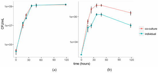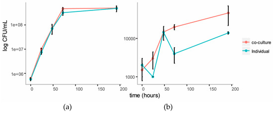 We established a co-culture of the two strains in BSM medium with cellulose (composed of glucose monomers) and galactomannan (mainly composed of mannose and galactose monomers) as the carbon source. Individual cultures of each strain were also established in this medium as controls. Growth of each strain in the individual and co-cultures were tracked over five days using plate counts (Figure 3). The growth of C. fimi was similar in the individual versus the co-culture. Growth of Y. lipolytica was enhanced in the co-culture versus the individual culture.