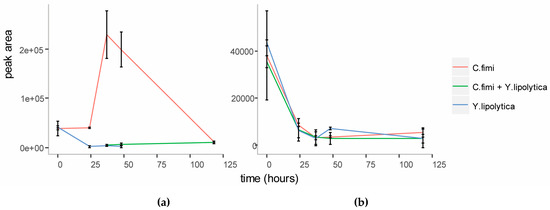Co-culture with C. fimi was found to increase the growth of Y. lipolytica on polymeric substrates, and we observe the depletion of diverse metabolites in co-culture vs. monocultures, which we attribute to cross-feeding. However, there are alternative explanations, for example, interspecific interactions may alter substrate preferences in co-culture vs. mono-culture. Reductionist experiments using mutants would be required to further unravel exactly what occurs in co-cultures. While this is beyond the scope of this work, the metabolomics methods and insights into potentially cross-feeding metabolites described provide important tools and insights to guide additional studies.