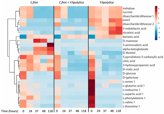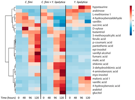Clustered heatmap of metabolites in individual cultures and co-cultures of Y. lipolytica and C. fimi at different time points in defined medium with ionic liquid-treated switchgrass lignocellulose as substrate.