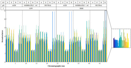 Retention factors for the 54 metabolites in the 48 chromatographic runs (matrix D). The table on the top shows the chromatographic conditions of each sample: (A) indicates the chromatographic runs perfumed using amide, (Z) zwitterionic, (B) BEH amide and (D) mixed-mode diol stationary phases. As an example, a zoomed view of chromatographic run 48 is depicted.