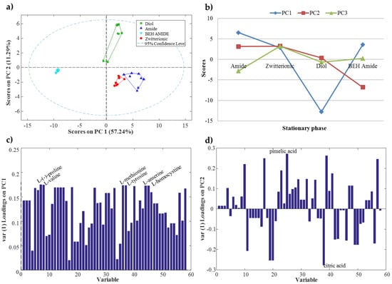ASCA loadings were useful to know which variables (metabolite retention factors) were the most important to distinguish the stationary phases. Figure 2c,d show the ASCA loadings plot for PC1 and PC2, respectively. For instance, six amino acids (l-(−)-proline, l-valine, l-methionine, l-tyrosine, l-homocysteine and l-anserine) showed a higher loadings value in PC1 (Figure 2c). Consequently, these amino acids were useful to distinguish mixed-mode diol stationary phase from the other three (amide, BEH amide and zwitterionic). In the case of PC2 (Figure 2d), pimelic and citric organic acids showed the highest loadings values. Therefore, these two organic acids appeared as important to differentiate BEH amide from the rest of the stationary phases.