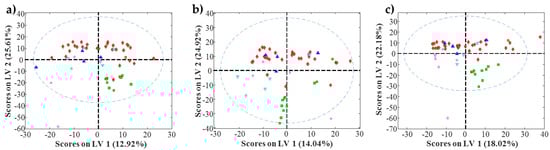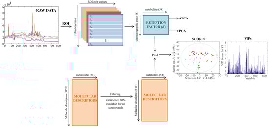 Figure 5 shows a complete picture of the data analysis strategy from the raw MS data to the chemometric modelling. First, raw chromatographic data files (in .raw format) were converted to the standard CDF format by Databridge function of MassLynxTM v 4.1 software (Waters, Milford, MA, USA). Then, these data files were imported into the MATLAB environment (Release 2015b, The Mathworks Inc., Natick, MA, USA) by using mzcdfread and mzcdf2peak functions of the MATLAB Bioinformatics Toolbox (4.3.1.version). LC-MS data were then arranged and aligned according to their m/z in a data matrix, containing retention times in the rows and selected m/z values in the columns. Here, this data matrix was built up using the previously proposed regions of interest (ROI) strategy [,]. The ROI approach selects the most relevant mass traces, which are those m/z values whose intensity signals are higher than a fixed signal-to-noise ratio threshold and appear a number of times consecutively in the time dimension. These mass traces are searched among all the chromatographic and spectral data. The obtained vectors, containing the intensity of the found ROIs at each time point, are reorganized into a matrix grouping ROIs among all the retention times. The final m/z values of each ROI are calculated as the mean of all m/z values obtained for that particular ROI. In this work, the parameters for the implementation of this ROI approach are the signal-to-noise ratio threshold (set at 0.1% of the maximum MS signal intensity), the mass accuracy of the mass spectrometer (set at 0.5 Da/e for the TQD MS analyzer used in this work) and the minimum number of consecutive retention times to be considered as a chromatographic peak (set at 25). More details on how this strategy works are given in previous works []. Finally, an ROI matrix was obtained for positive and negative ionization modes for each of the 72 chromatographic runs of the present study.
