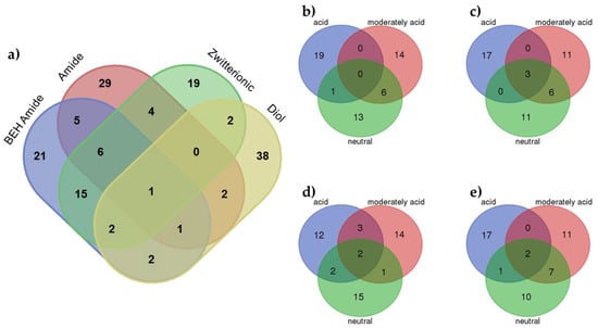 Venn diagrams of the VIPs MDs at (a) each stationary phase considering all pH values; (b) BEH Amide at each pH condition; (c) Amide at each pH condition; (d) Zwitterionic at each pH condition and (e) Diol at each pH condition.
