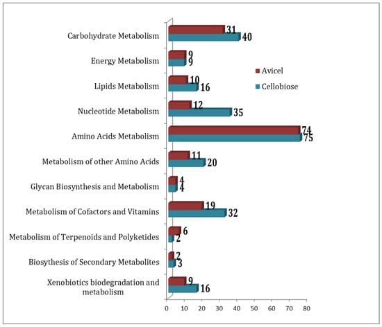 Distribution of compounds under the metabolic pathways as detected in cellobiose (blue) and Avicel (red) media condition formulation.
