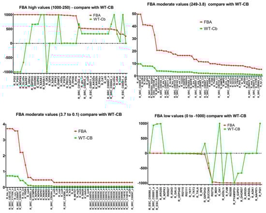 Changed active reactions: The reaction flux comparison with respect to FBA simulations (without metabolites data) can be divided into 4 parts—reactions with high flux (1000 to 250), moderate flux (249 to 3.8), low flux (3.8 to 0), and negative flux (0 to −1000).
