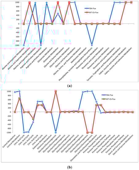 Computational predictions of fluxes through pathways for (a) amino acid metabolism and (b) carbohydrate metabolism using flux balance analysis (Flux-FBA) and after integrating metabolomic data for growth on cellobiose (Flux-WT-Cb).