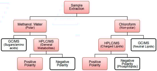 Metabolite profiling techniques used for the current study are highlighted in red. For both polar and non-polar metabolites, more exhaustive detections are observed in positive polarity mode, and thus, was the mode of choice in this experiment [,].