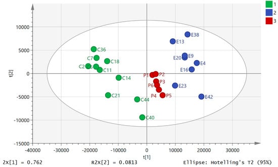The data was extracted by using MZ Match software (http://mzmatch.sourceforge.net/) [63] and the identification of putative metabolites was made via the macro-enabled Excel file, Ideom (http://mzmatch.sourceforge.net/ideom.html). The lists of the metabolites obtained from these searches were then carefully evaluated manually by considering the quality of their peaks and their retention time match with the standard metabolite mixtures run in the same sequence. All reported metabolites were within 3 ppm of their exact masses. Statistical analyses were performed using both univariate with Microsoft Excel and multivariate approaches using SIMCA-P software version 14.1 (Umetrics, Umea, Sweden). All subsequent metabolite responses were compared by paired t-test using Microsoft Excel in order to indicate significant differences, where p < 0.05. Multivariate data analysis was employed with SIMCA by fitting PCA-X models having refined the metabolite lists by removing metabolites with RSD values >20% in the pooled samples.