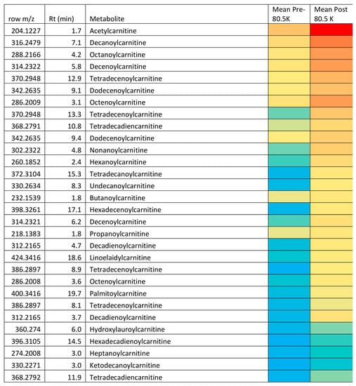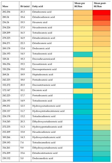 As can be seen in Table 1 there were a very large number of metabolic changes resulting from the bout of ultramarathon running, with many amino acids decreasing in abundance while there were increases in the levels of many acylcarnitines, fatty acids and oxidized fatty acids. In many cases, the findings are significant for the comparison of the pre- and post-80.5 km samples and a false discovery rate (FDR) test confirmed the significance to all metabolites with p < 0.05 [35]. In order to gain a comprehensive overview, analysis was also carried out by RP chromatography, which was useful for getting a clearer picture of the lipophilic compounds in plasma including long-chain acylcarnitines, fatty acids and oxidized fatty acids. The results from the RP analysis of acylcarnitines, fatty acids and oxidized fatty acids are also shown in Table 1. The RP mode was better for these classes of compounds since in HILIC mode they all eluted close to the column void volume. Table S1 shows the metabolites, which were matched against a standard. Table S2 shows a list of the standards that were run in five standard mixtures plus a mixture of free fatty acids derived from two fixed oils, olive oil and cod liver oil.