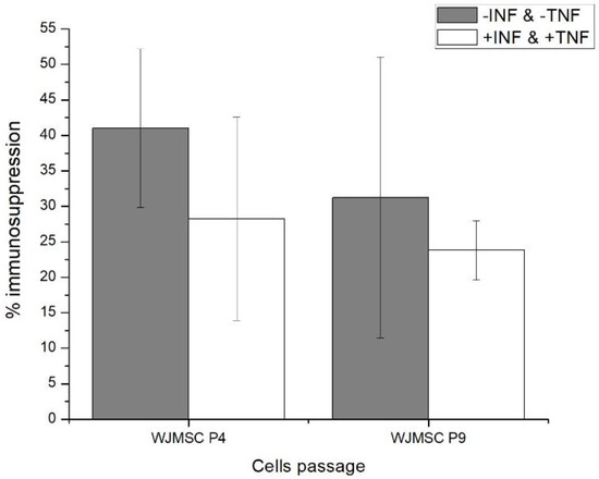 A mixed lymphocyte reaction analysis (MLR) was performed, as proposed by Weiss et al. [23], who revealed that the immunosuppressive phenotype of human umbilical cord mesenchymal stem cells (hUCMSC) strongly decreases between the 5th and the 9th passages. In the present case, MLR analysis of WJMSCs at the 4th and 9th passages show no significant difference in their immunomodulatory function, based on a Student’s t-test of 0.295 as compared to the reference value of 2.132 for the 95% confidence interval. However, although not statistically significant, one can observe a decreasing tendency of the cells immunomodulatory function between the 4th and the 9th passages (Figure 1). This observation suggests that similar to the work of Weiss et al. [19], WJMSCs may preserve strong immunomodulatory function among early passages, such as up to the 2nd or the 3rd. Of interest, similar conclusions can be drawn in the presence or absence of INFγ and TNFα. In addition, it should be noted that the large SEM error bars can be attributed to the fact that WJMSCs are a subset of hUCMSCs, which are composed of various types of MSCs that are found in the umbilical cord.