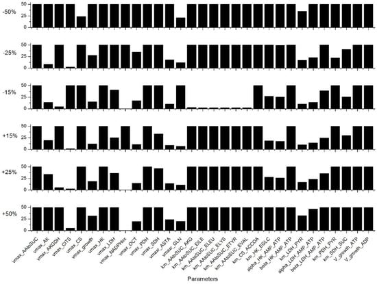 The metabolic model was first calibrated combining experimental data for P4 and P9 cells, as described in Appendix B. The value of the 234 parameters (Table S3, Supplementary Materials) that are minimizing model simulation error were then determined. Then, a sensitivity analysis was performed, assessing each parameter and the most sensitive parameters were identified as described in the Appendix C. Indeed, of the 234 parameters, 31 are considered as highly sensitive, as they induce a variation of more than 10% of the global simulation error from a change of only 15% of their value (Figure 2). Most of these parameters are involved in the TCA cycle: such as the theoretical asymptotic maximal activities , , , , , , and the half-saturation constants , , , , , , and . Another group of sensitive model parameters is within the glycolysis pathway with especially reactions catalysed by HK and LDH with , , , , , , , and . One parameter affects the glutaminolysis (), one is involved in the urea cycle (), and the others are related to cell energetics state and the cell specific growth rate with , , , , and , respectively. Our results clearly show that model sensitive parameters are widely distributed throughout the metabolic network, and this is not surprising as it highlights that the central carbon metabolic pathways are vital when describing cell behaviour. Indeed, we have identified a similar subset of sensitive parameters in previous studies with CHO cells [28,30,31]. The sensitive role of the LDH enzyme has also been identified by Nolan et al. for another CHO cell line [32]. Interestingly, the parameters of the intermediate reactions of glycolysis, such as PGI, phosphoglycerate kinase (PGK), or PK were not sensitive in the WJMSC model, contrarily to CHO cells [28,30,31].