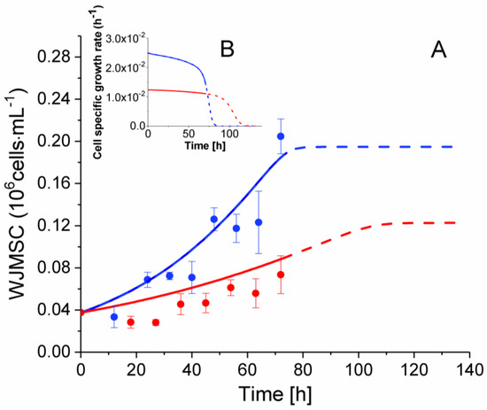 Cultivated under inflammatory conditions from 0 to 72 h, P4 WJMSC cells show a higher specific average growth rate of 2.36 × 10−2 h−1 (i.e., doubling time of 29.4 h) as compared to 1.36 × 10−2 h−1 (i.e., doubling time of 51.0 h) for the late P9 passage cells (Figure 3). Indeed, this difference in their growth rate is also captured in the model, with a maximum specific growth rate () for P4 cells of two times that of P9 cells (Table 1). From a similar inoculation of 0.0375 × 106 cells mL−1, P4 cells reached 0.205 ± 0.029 × 106 cells mL−1 at 72 h as compared to 0.1 ± 0.026 × 106 cells mL−1 for P9 cells. This result is in agreement with Kang et al. who observed a decreasing growth rate with an increase of the passage number in human bone marrow mesenchymal stem cells and umbilical cord blood cells [33]. Both of the cell cultures were stopped at 72 h here, when P4 cells reached confluency. Behavioral artifacts are generated when the cells reach confluency with dense cell-cell contacts.