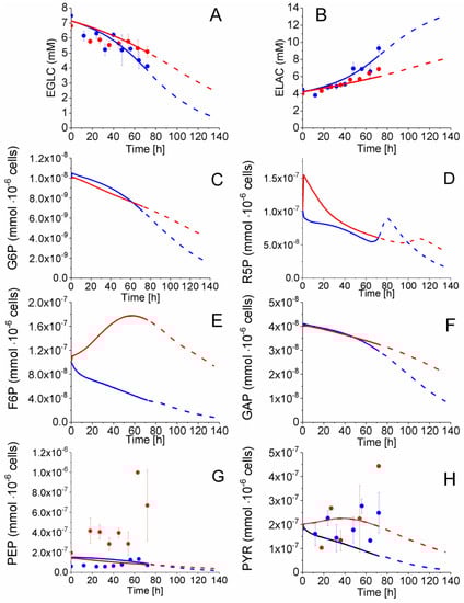 Extracellular glucose (EGLC) uptake, extracellular lactate (ELAC) production, and intracellular pyruvate (PYR), and phosphoenolpyruvate (PEP) concentrations were measured with time whereas glucose-6-phosphate (G6P), fructose-6-phosphate (F6P) and glyceraldehyde-3-phosphate (GAP) concentrations were estimated from model simulations (Figure 4). Before 54 h, glucose consumption and lactate secretion behaviour followed similar trends for both P4 and P9 cells, calculated from experimental data and model simulation. However, according to model simulation of species concentration, the cell passage effect starts being observed from 54 h with EGLC and ELAC concentrations showing diverging trends comparing P4 to P9 cells. Indeed, from 54 to 72 h, an average specific glucose uptake rate of 3.4 × 10−4 mmol·10−6 cells·h−1 was estimated for P4 cells as compared to 2.4 × 10−4 mmol·10−6 cells·h−1 for P9 cells, whereas the average lactate specific production rates were of 5.8 × 10−4 mmol·10−6 cells·h−1 for P4 cells and 5.6 × 10−4 mmol·10−6 cells·h−1, according to experimental data. Looking at intracellular metabolic intermediates of glycolysis, PYR concentration remained constant and at similar levels of 2 × 10−7 mmol·10−6 cells in P4 and P9 cells (Figure 4H), while PEP cell concentration also remained constant but at distinct levels with 1 × 10−7 mmol·10−6 cells in P4 cells and 4 × 10−7 mmol·10−6 cells in P9 cells (Figure 4G).