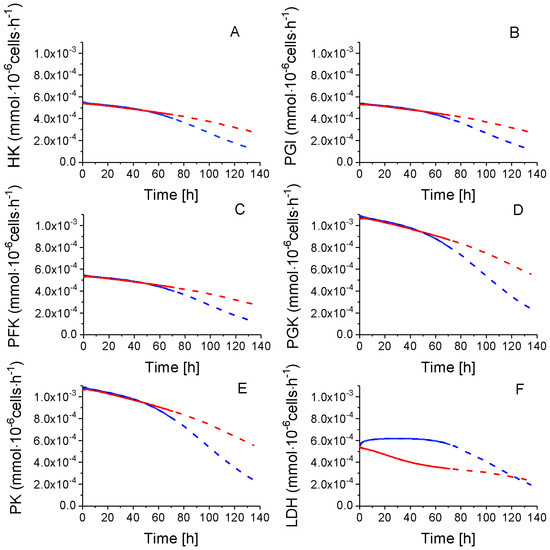 Glycolysis fluxes of WJMSC. (A) Hexokinase flux; (B) Phosphoglucose isomerase flux; (C) Phosphofructokinase flux; (D) Phosphoglycerate kinase flux; (E) Pyruvate kinase flux; and, (F) Lactate dehydrogenase flux. Same conditions and symbols as in Figure 3 applied.