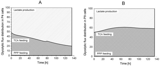 Glycolysis flux distribution. (A) P4 cell culture; (B) P9 cell culture.