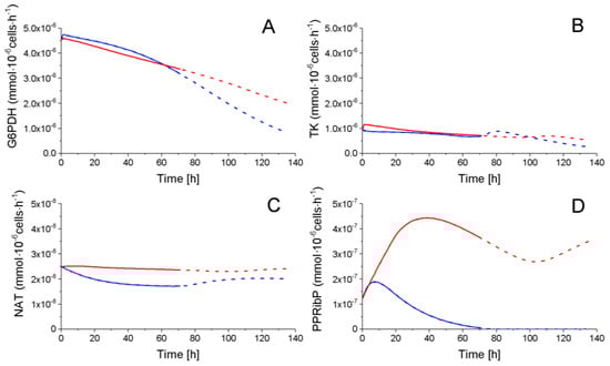Fluxes of PPP. (A) Glucose-6-phosphate dehydrogenase flux; (B) Transketolase flux; (C) NAT flux; and, (D) Phosphoribosyl pyrophosphate flux. Same conditions and symbols as in Figure 3 are applied.