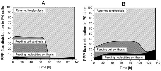 The analysis, by the use of model simulation, regarding the distribution of PPP fluxes to cell synthesis, nucleotides synthesis as well as returning to glycolysis, reveals that 55% of the incoming G6PDH flux returns to glycolysis in P4 cells, but this contribution reaches 65 to 75% in P9 cells, in their growth phase (Figure 8). However, P4 cells direct a higher part of the PPP flux to cell synthesis as compared to P9 cells; a result agreeing with P4 higher specific cell growth rate observed experimentally. P4 cells require around 40% of the PPP flux in their growth phase, whereas it reaches only 20% in P9 cells. Furthermore, P4 cells only need 3 to 5% of the PPP flux for nucleotide synthesis, which represents half of P9 cells requirements. PPP flux dynamics maintained a NADPH-to-NADP ratio of ~1 (Figure S1), which was similar to that observed in hMSCs [35].