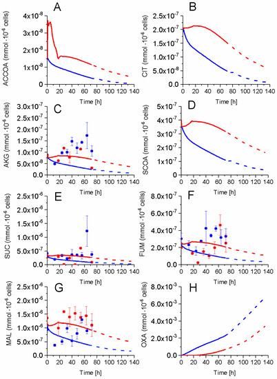 The impact of successive cell passages on TCA cycle activity was also studied. The cell concentrations in major TCA intermediates, such as malate (MAL), succinate (SUC), alpha-ketoglutarate (AKG), and fumarate (FUM) were measured while model simulation enabled the determination of citrate (CIT), succinyl-CoA (SCOA), oxaloacetate (OXA) concentrations, as well as the TCA precursor acetyl-CoA (ACCOA) (Figure 9). SUC and AKG concentrations showed similar but specific behaviours in P4 and P9 cells. SUC concentration remained constant in both cultures at an average value of 3.3 × 10−7 mmol·10−6 cells·h−1, increasing briefly from 54 h in P4 cells. In both conditions, AKG increased from 8.6 × 10−8 to 1.3 × 10−7 mmol·10−6 cells·h−1 at 54 h decreasing slightly thereafter. FUM concentration showed a similar increasing behaviour in both P4 and P9 cells, although maintaining a higher concentration in P4 cells. In the case of MAL, its intracellular concentration stayed higher in P9 as compared to P4 cells. In the simplified metabolic network described in the model, FUM is synthesized by succinate dehydrogenase (SDH) and also by argininosuccinate lyase (ASL), a combination that may explain a higher FUM concentration level in P4 cells due to a higher activity of ASL in the Urea cycle in P4 when compared to P9 cells. The concentration of non-measured metabolites were estimated from model simulation, with higher concentrations for all simulated TCA intermediates in P9 cells except for OXA. Higher amounts of TCA intermediates, which suggests a more active TCA cycle in P9 cells, agrees with the above-mentioned observation of a respiratory metabolism in these late passage P9 cells as compared to P4 cells.