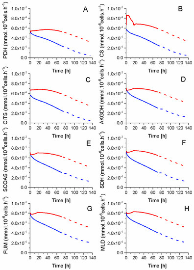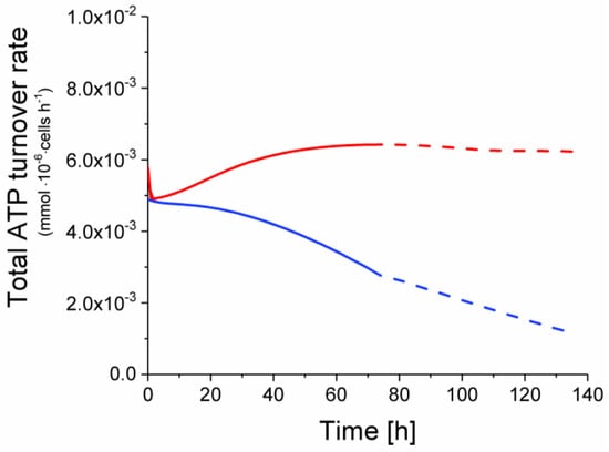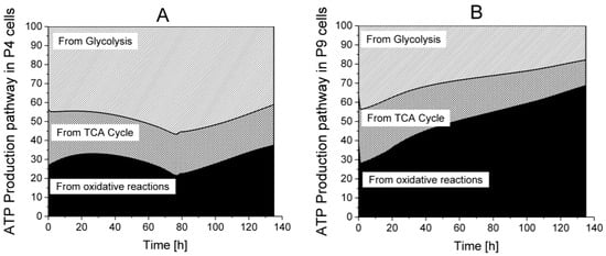 Model simulation also allowed estimating the global ATP turnover rate. In agreement with an active TCA cycle, it is clear that the ATP turnover rate was higher in P9 cells, with a total ATP production rate starting from 4.9 × 10−3 and increasing at a stable value of 6.2 × 10−3 mmol·10−6 cells·h−1 (Figure 11). Conversely, the ATP turnover rate in P4 cells regularly decreased from an initial value of 4.9 × 10−3 to 1.2 × 10−3 mmol·10−6 cells·h−1 at the end of the simulation.