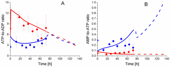 In this work, energetic and redox nucleotides were quantified and simulated by the model, as concentrations (Supplementary Materials, Figure S1), as well as energetic ratios (Figure 13). Interestingly, comparing nucleotide concentration showed no clear differences between P4 and P9 cells (Figure S1), but the analysis of nucleotide ratio reveals clear distinct behaviour with cell age. In P9 cells, ATP-to-ADP ratio regularly decreases from 13.0 to 5.1, while this energetic ratio stays constant and at a lower level in P4 cells; between 2.3 ± 0.6 to 4.8 ± 3.2, as observed experimentally and simulated by the model. The AMP-to-ATP ratio in P9 cells, however, shows a constant slight increase from 2.6 ± 0.5 × 10−2 to 10.2 ± 9.2 × 10−2, but to a lower level than in P4 cells in which this ratio evolves with no clear trend between 2.9 ± 0.3 × 10−1 and 1.5 ± 1.1 × 10−1. Interestingly, the simulation of the ATP-to-ADP ratio closely reflects experimental data, while the model simulation trends slightly differ from experimental values for the AMP-to-ATP ratio. The ATP and ADP concentrations agree with previous results in CHO cell lines [28,30,31], and lead to similar ATP-to-ADP ratio levels. However, the AMP concentration is five times higher in WJMSCs than CHOs with a value of ~5 × 10−7 mmol·10−6 cells. Taking the higher ATP-to-ADP ratio observed (and simulated) in P9 cells, results that are consistent with a respiratory metabolism, the expected low AMP-to-ATP ratio is observed (and simulated). Interestingly, both experimental ATP-to-ADP and AMP-to-ATP ratios tend to reach similar values at the end of the cultures, which coincided with P4 cell confluency and growth rate reduction (see above). Hardie et al. proposed a high AMP-to-ATP ratio as a marker of oxidative stress [42]. Moreover, they demonstrated that an oxidative stress could activate the AMP-activated protein kinase (AMPK), leading to the inhibition of ATP-consuming pathways such as glucose uptake, reduction of cell growth, and the activation of efficient ATP-producing pathways [43,44]. Thus, our results on the energetic nucleotides suggest the WJMSCs immunomodulatory phenotype can support a higher oxidative stress level, a hypothesis also supported by a glycolytic metabolism. However, the change of phenotype impedes P9 cells to support such oxidative stress level, which cause a switch from a glycolytic to a respiratory metabolism, as observed in this work.