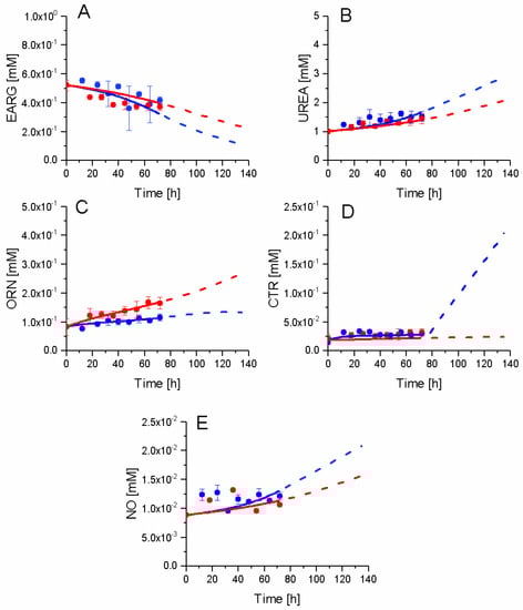Effect of cell passage on urea cycle intermediates. (A) Extracellular arginine concentration; (B) Extracellular urea concentration; (C) Ornithine concentration; (D) Citrulline concentration; and, (E) Nitric oxide concentration. Same conditions and symbols as in Figure 3 are applied.
