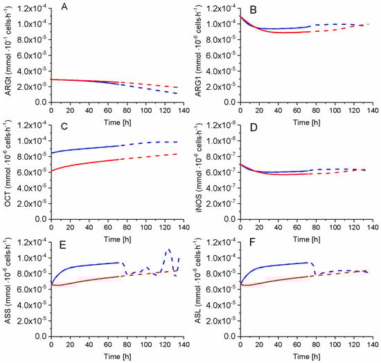 Urea cycle fluxes. (A) Arginine transferase flux; (B) Arginase-1 flux; (C) Ornithine carbamoyltransferase flux; (D) Inducible nitric oxide synthetas flux; (E) Argininosuccinate synthase flux; and, (F) Argininosuccinate lyase flux. Same conditions and symbols as in Figure 3 are applied.