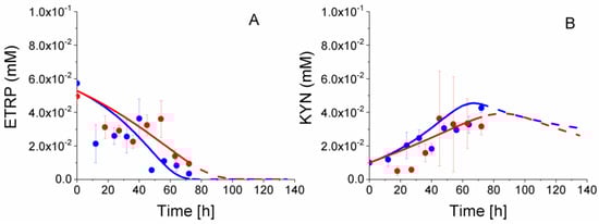 Tryptophan metabolism is also well known as a key biomarker of an immunosuppressive phenotype [6,47]. Indeed, in agreement with our MLR data, experimental concentration data show a faster ETRP consumption in P4 cells (Figure 16). P4 ETRP concentration continuously decreases, with model simulations suggesting this essential amino acid being a potential limiting nutrient of cell growth (from model simulations). At the opposite, KYN concentration increased during P4 and P9 cells growth, for decreasing from ETRP depletion (estimated from model simulations).