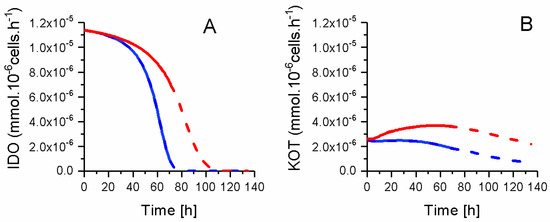 ETRP metabolism fluxes. (A) Indoleamine 2,3-dioxygenase flux; (B) Kynureninase flux. Same conditions and symbols as in Figure 3 are applied.