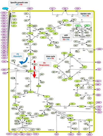 The pentose phosphate pathways (PPP) is consuming a minor part of the glycolytic flux, as mentioned above, with a glucose-6-phosphate dehydrogenase (G6PDH) flux of ~10−6 mmol·10−6 cells·h−1 as compared to a glycolytic global flux of ~10−4 mmol·10−6 cells·h−1 for both P4 and P9 cells (Figure 7). Ribose-5-phosphate (R5P), the only PPP intermediate, which cell concentration was quantified, shows a similar decreasing trend for both P4 and P9 cells (Figure 4). The transketolase (TK) enzyme shows a similar decreasing trend for both P4 and P9 cells, and the reaction flux producing NAD from R5P (NAT) stayed constant for both conditions with, however, a higher value for P9 cells. Interestingly, phosphoribosyl pyrophosphate (PPRibP) activity is much higher in P9 cells with 2.5 × 10−7 mmol·10−6 cells·h−1, whereas it decreases in P4 cells at 80 h from an initial value of 12 × 10−7 to 1.7 × 10−1 mmol·10−6 cells·h−1. Of interest, the simulated G6PDH flux is similar in magnitude (~10−6 mmol·10−6 cells·h−1) to values reported in literature for CHO cells [31,37].