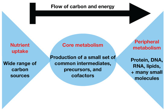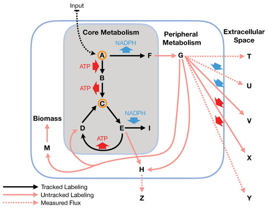 While C MFA has been performed at the genome scale for E. coli [16], it is a computationally expensive method and requires knowledge of all of the carbon transitions in the network. This knowledge is nontrivial to obtain systematically for any desired organism [17,18,19,20,21,22]. Two-scale C Metabolic Flux Analysis [23] (2S-C MFA) is an alternative technique that constrains genome-scale models with C labeling experimental data. 2S-C MFA constrains all fluxes in the genome-scale model simultaneously using stochiometric and C labeling constraints, but does so at two resolution scales: for core reactions, both stochiometric and C labeling constraints are used, whereas, for non-core reactions, only stochiometric constraints are used. 2S-C MFA is meant to obtain the same results as genome-scale C MFA if we assume that flux flows from core to peripheral metabolism and there is limited flow back. This assumption is named the two-scale or bow tie approximation (Figure 1 and Figure 2) and stems from the bow tie structure of cellular metabolism, a universally conserved product of evolution [24,25]. Hence, in this paper, we will refer to it indistinctly as the bow tie approximation or the two-scale approximation. The bow tie structure entails, as shown in Figure 1, that almost all carbon and energy sources are converted through central carbon metabolism pathways into a set of twelve precursor metabolites (glucose-6-phosphate, fructose-6-phosphate, ribose-5-phosphate, erythrose-4-phosphate, glyceraldehyde-3-phosphate, 3-phosphoglycerate, phosphoenol-pyruvate, pyruvate, acetyl-CoA, 2-oxoglutarate, succinyl-CoA, and oxaloacetate), which are the building blocks of most cellular components and natural products synthesized by cells [26]. Hence, if carbon sources are included in the core metabolism, the bow tie structure implies that flux flows from core to peripheral metabolism and there is limited flow back. This bow tie approximation is experimentally justified by the fact that traditional C MFA, using only core metabolism models, can convincingly explain labeling patterns for amino acids and intracellular metabolites for model organisms [27,28,29,30], and by experimentally verified metabolic engineering predictions using 2S-C MFA [5].